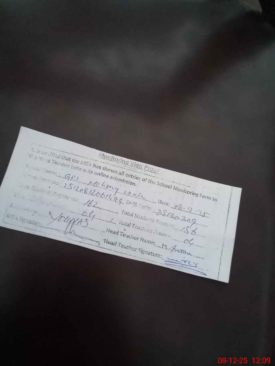 | Attendance Register | Head Teacher | MEA with School | Visit Proof |