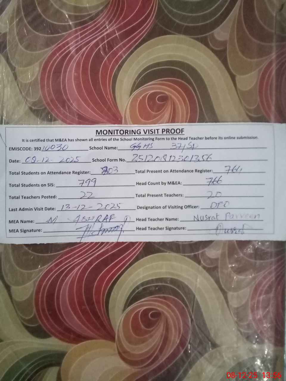 | Attendance Register | Head Teacher | MEA with School | Visit Proof |