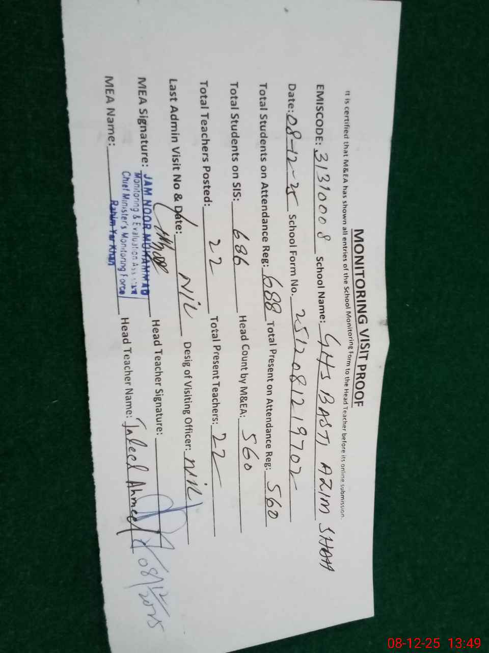 | Certified that this School was Inspected by the Undersigned MEA/DMO Today and the Information Stated Above is as Per Record. | |||||