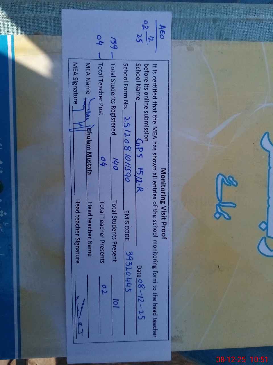 | Attendance Register | Head Teacher | MEA with School | Visit Proof |