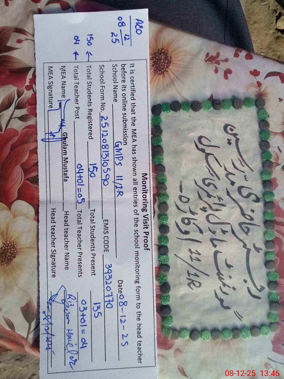 | Remarks (Use Separate Page if Required): Last visit by AEO is on 08.12.25 There are 05 toilets out 05, 02 are partially dangerous The play ground is in poor condition owing to non availability of boundary wall | |||||
