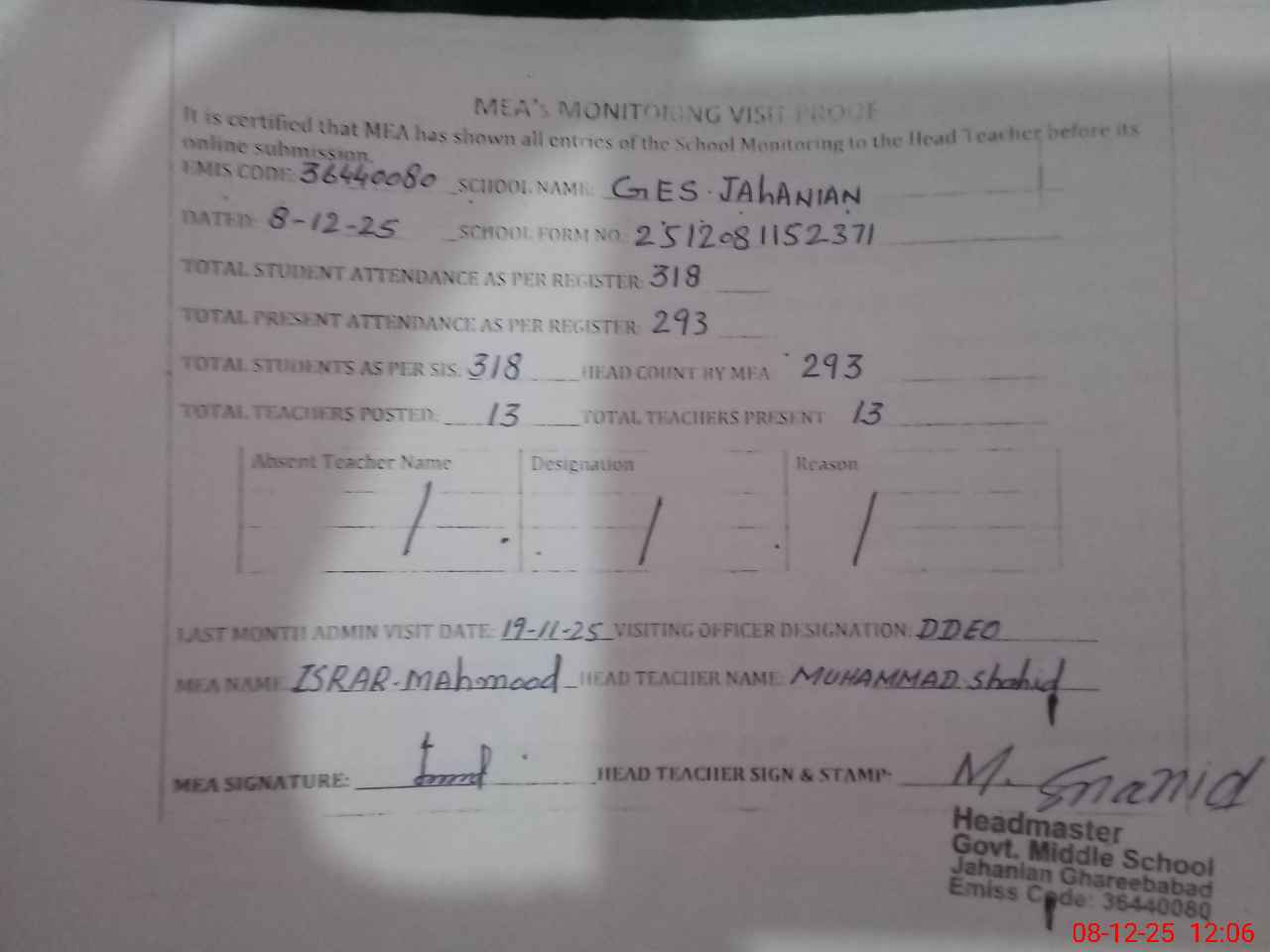 | Attendance Register | Head Teacher | MEA with School | Visit Proof |
