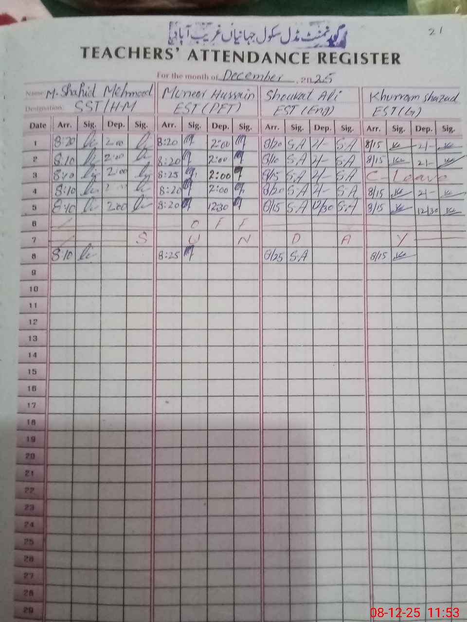 | CNIC | Full Name | Designation | R/C | Absence During Last Calender Month |