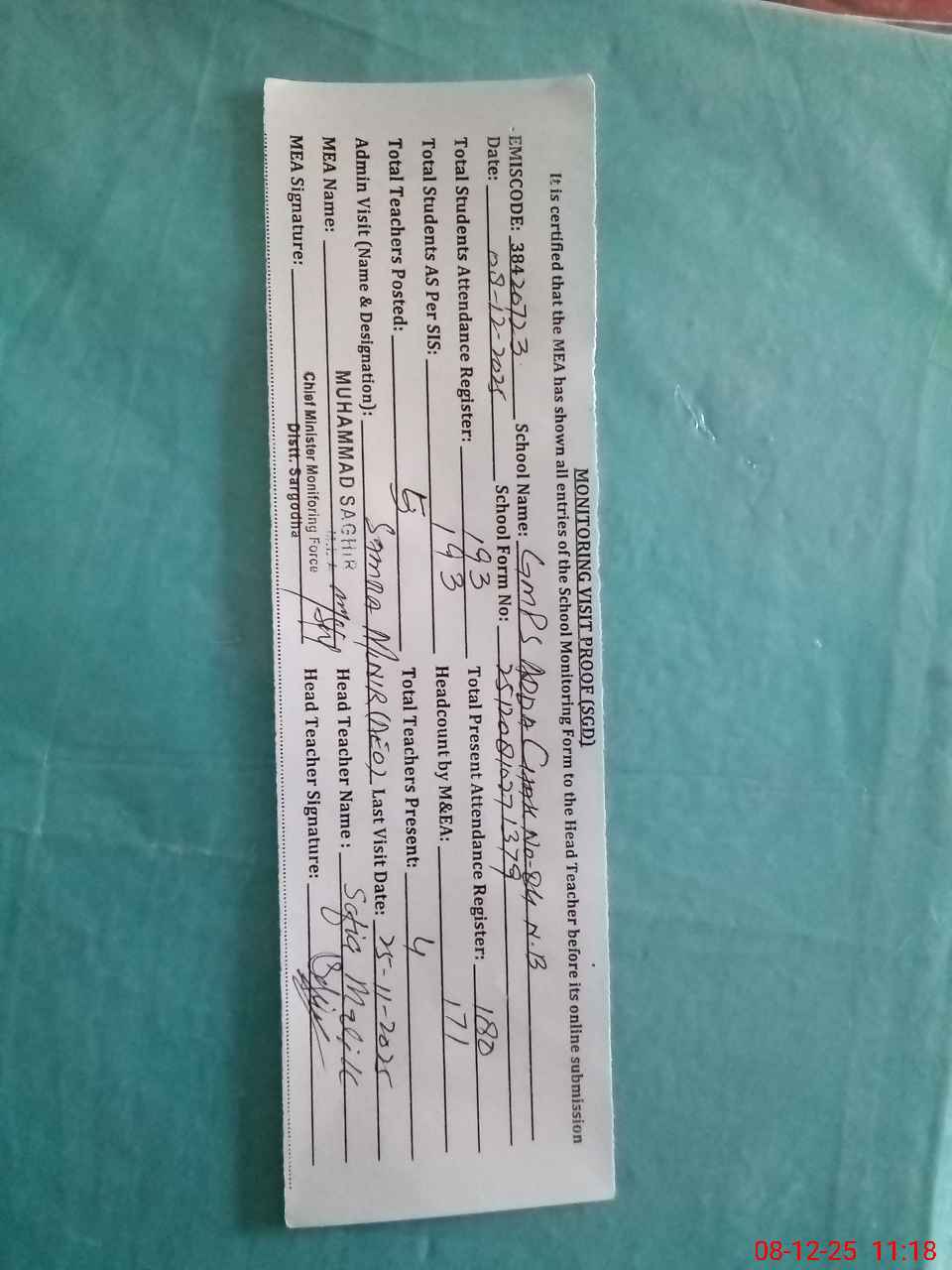 | Attendance Register | Head Teacher | MEA with School | Visit Proof |