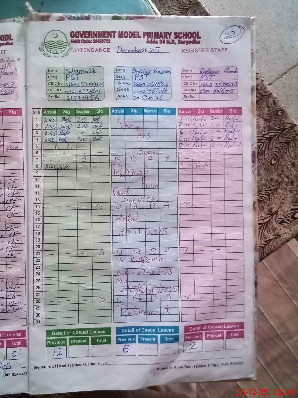 | CNIC | Full Name | Designation | R/C | Absence During Last Calender Month |