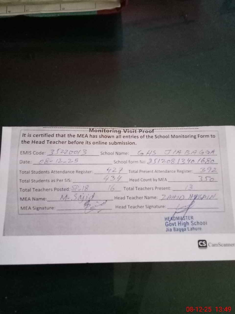 | Remarks (Use Separate Page if Required): Jnr Clerk Aatir Hussain is absent since 25 Aug 2025 Present students percentage is 81 percent 42 students has gone to home after paper according to head and this 42 students difference found in Roznamcha and head count Security guard Muhammad Arshad is suspended and on disposal of CEO 35220013 | |||||