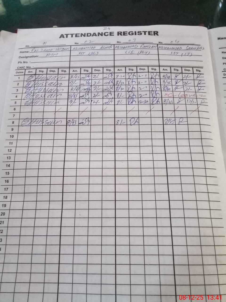 | CNIC | Full Name | Designation | R/C | Absence during last cal. month |
