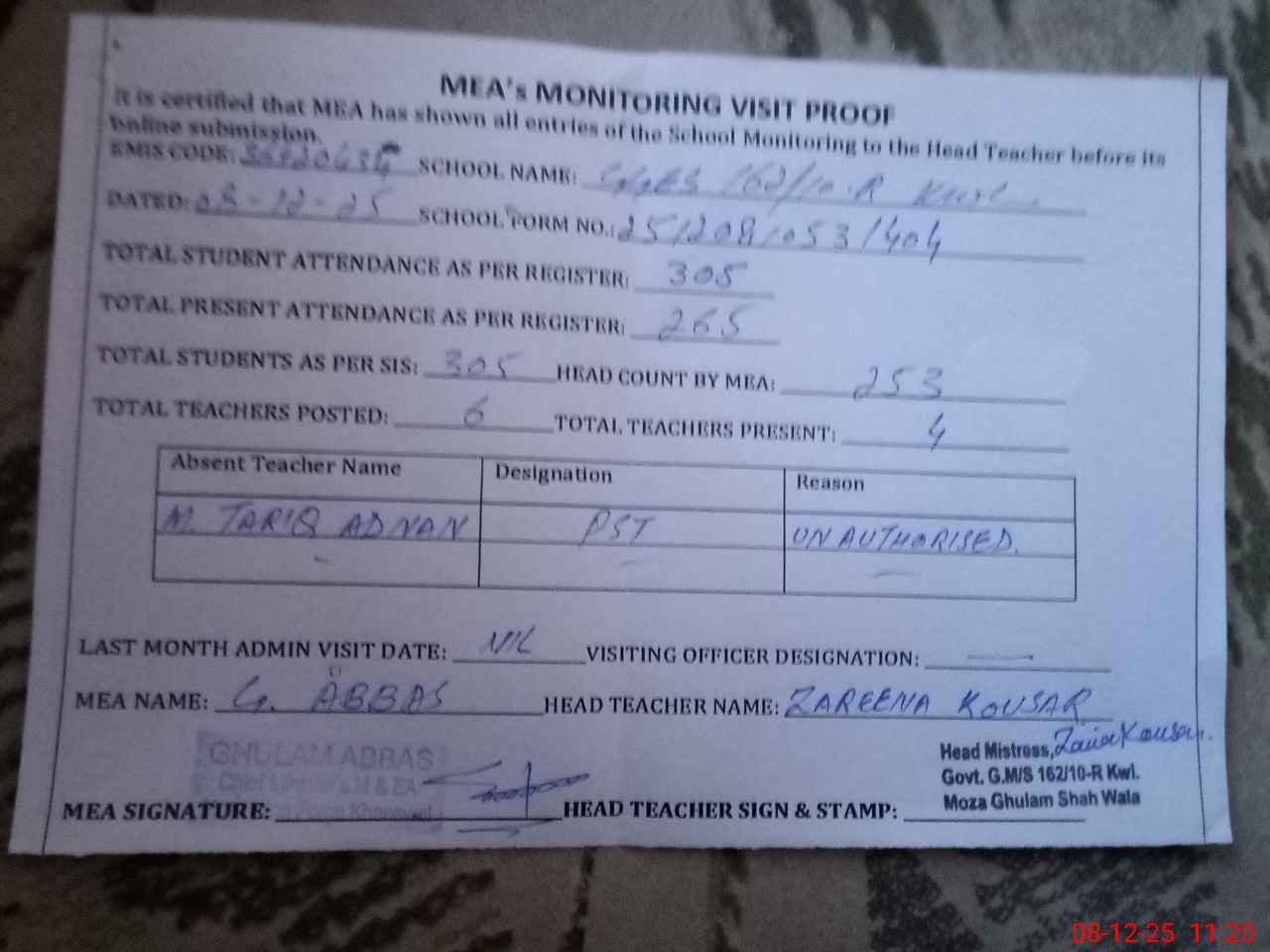 | Attendance Register | Head Teacher | MEA with School | Visit Proof |