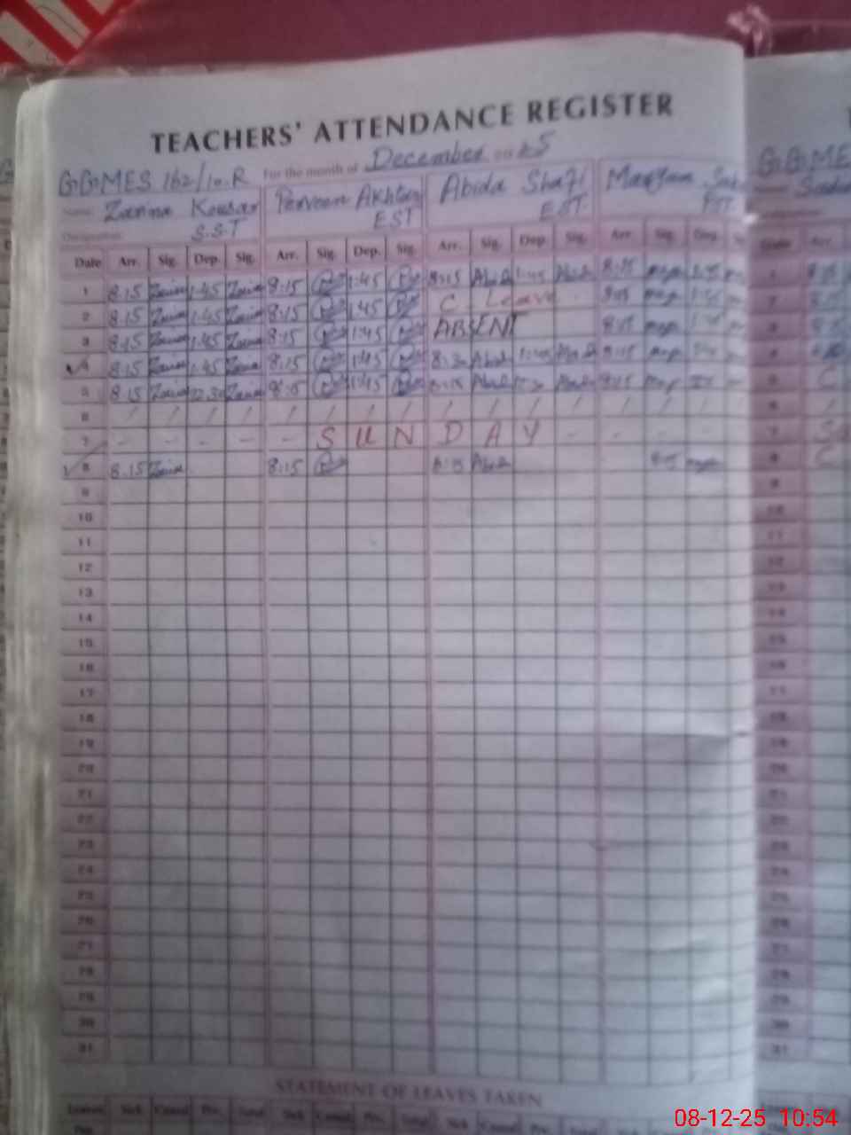 | CNIC | Full Name | Designation | R/C | Absence During Last Calender Month |