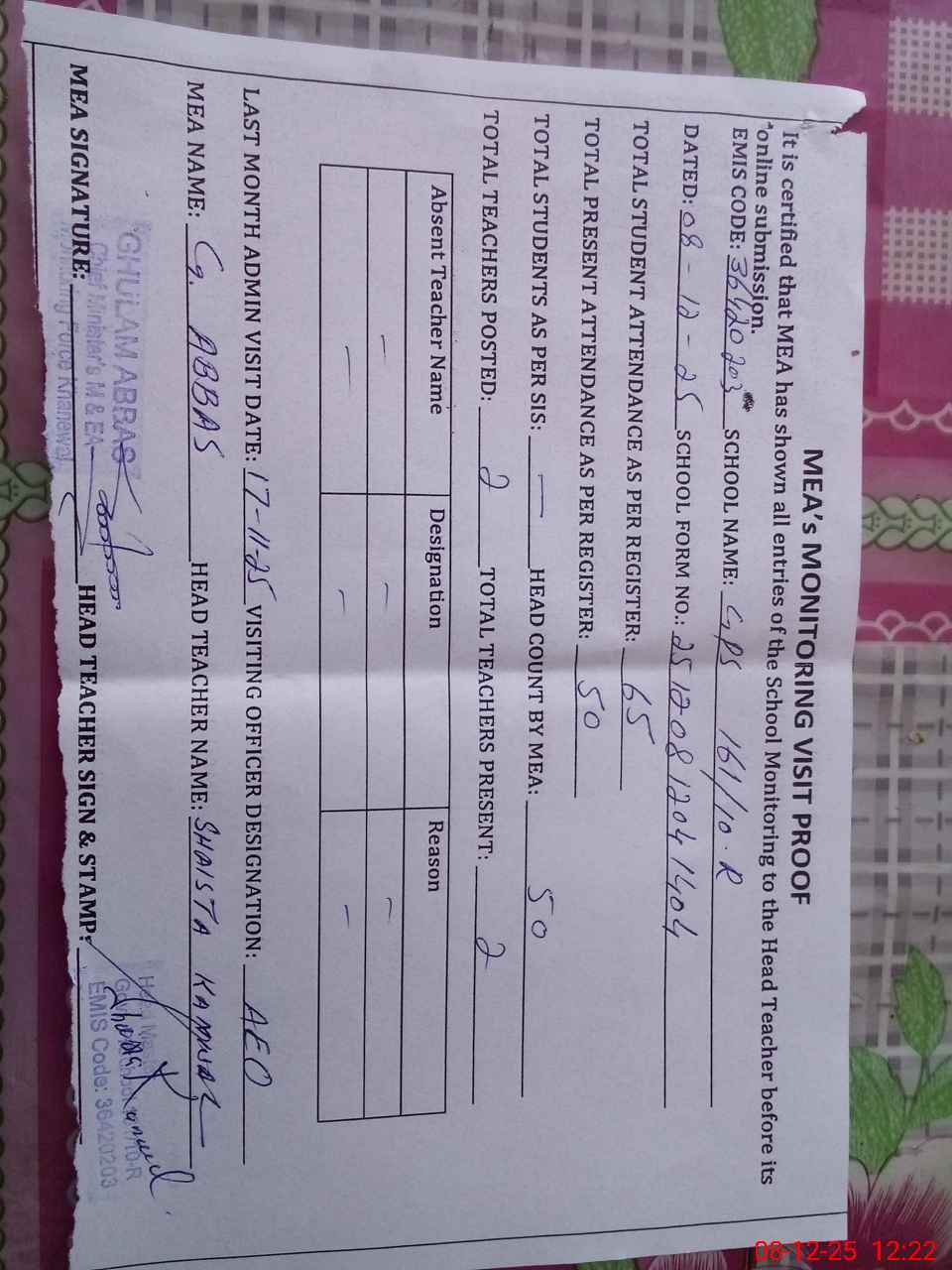 | Attendance Register | Head Teacher | MEA with School | Visit Proof |