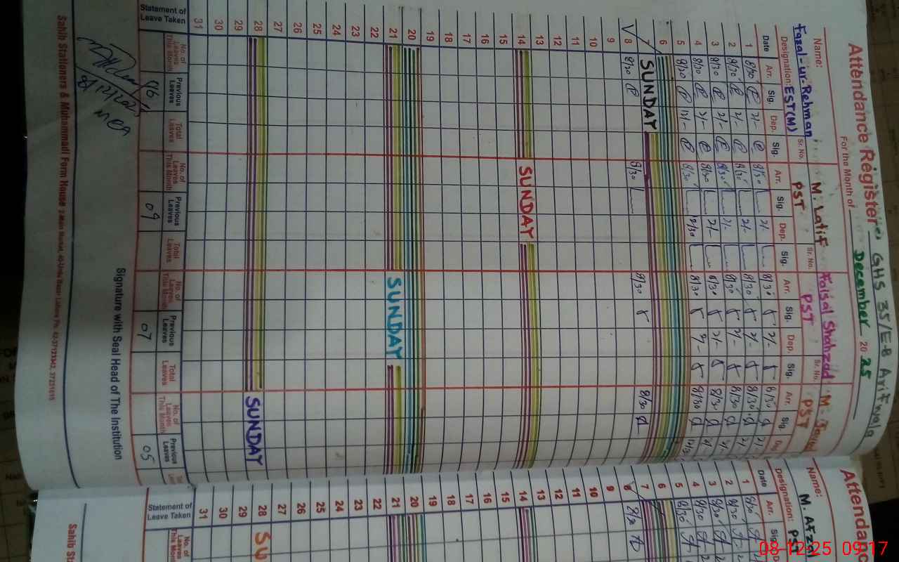 | CNIC | Full Name | Designation | R/C | Absence During Last Calender Month |