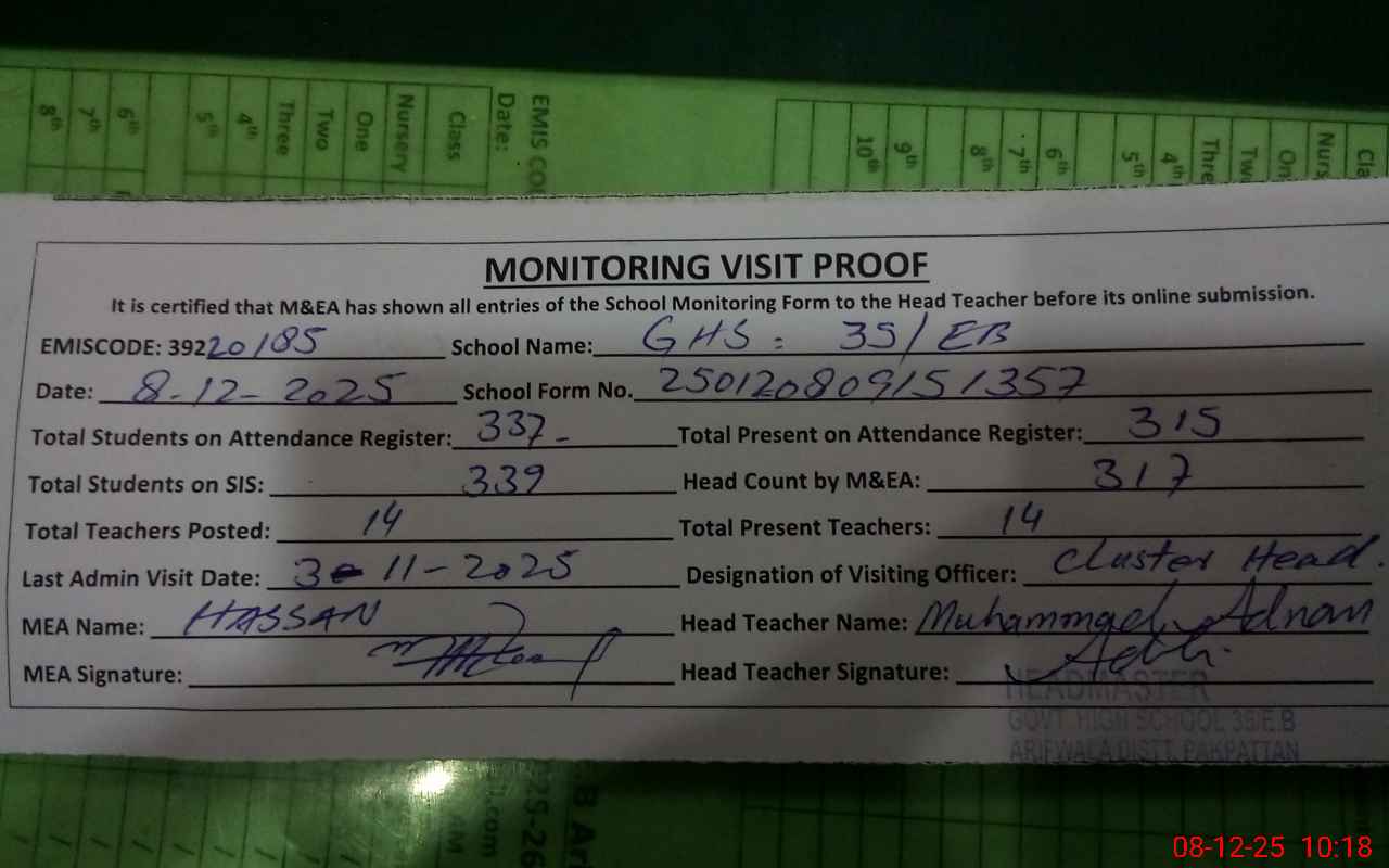 | EMIS Code: 39220185 | Name of School: GHS 35 EB ARIFWALA | |||