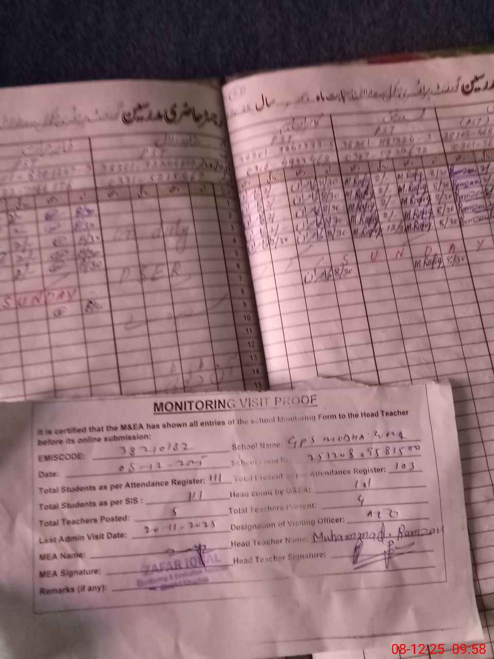 | Attendance Register | Head Teacher | MEA with School | Visit Proof |