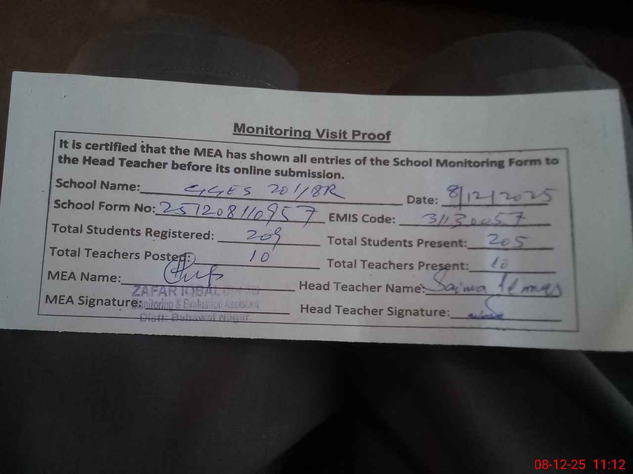 | Monitoring Date: 08-12-2025 | Start Time: 08-12-2025 11:00 AM | End Time: 08-12-2025 11:14 AM | Name of MEA: Za**** Iq**** BN**** | |