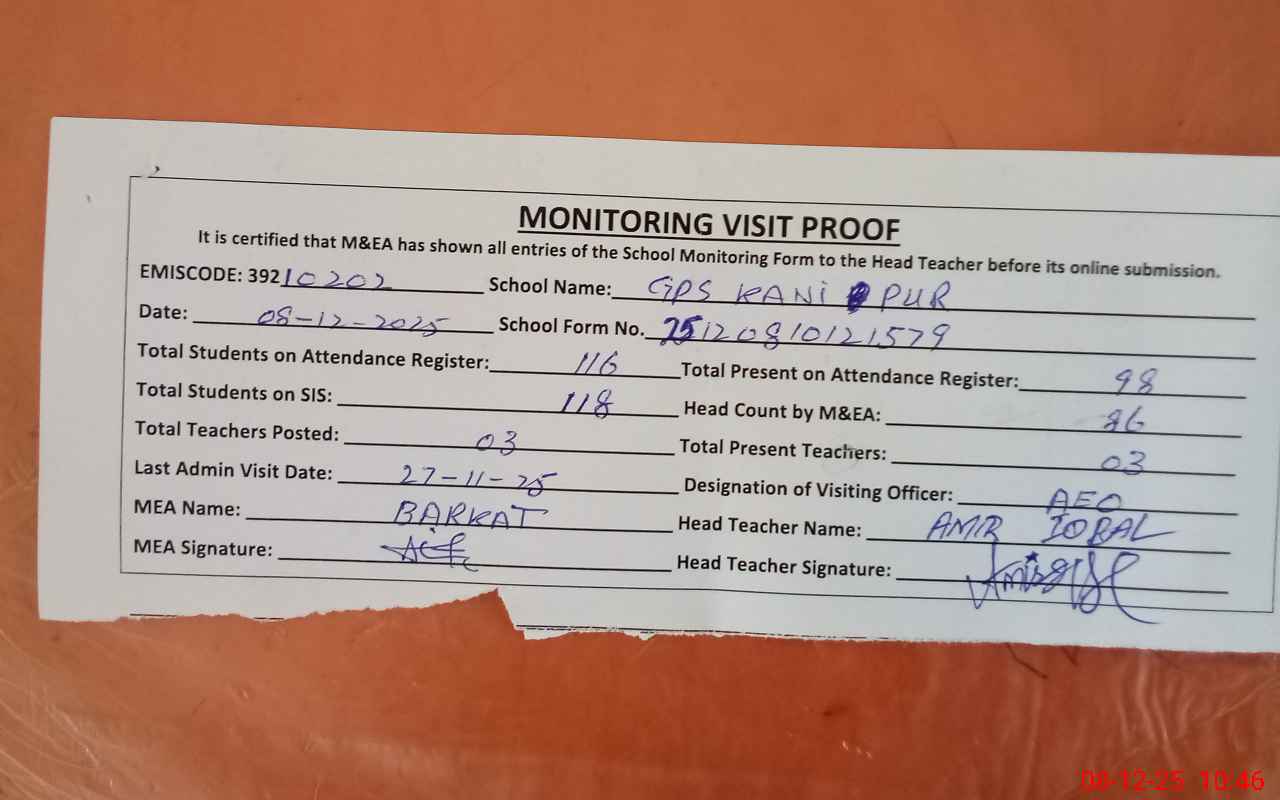 | EMIS Code: 39210202 | Name of School: GPS KANI PUR PO KUMAHARI WALA | |||