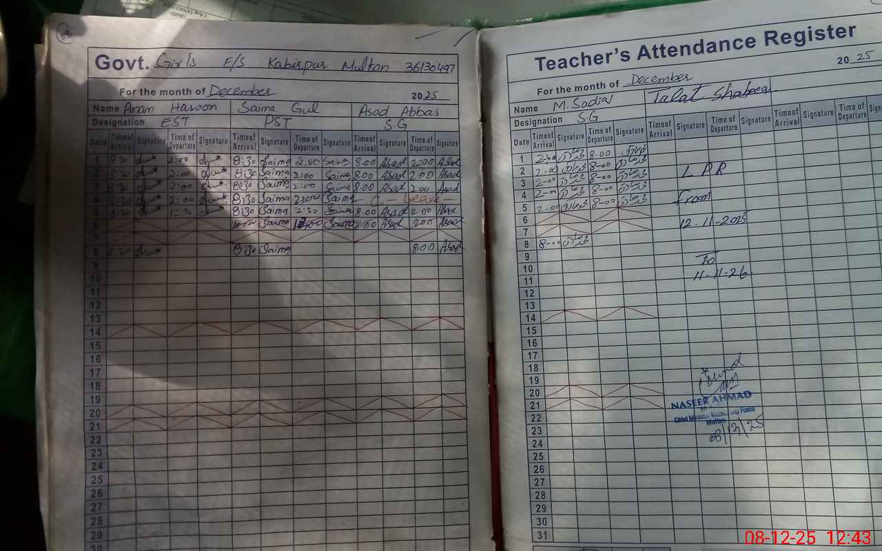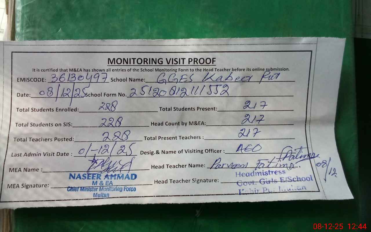 | District: MULTAN | Tehsil: MULTAN SADAR | Markaz: KABIR PUR - FEMALE | Level: Middle | |
