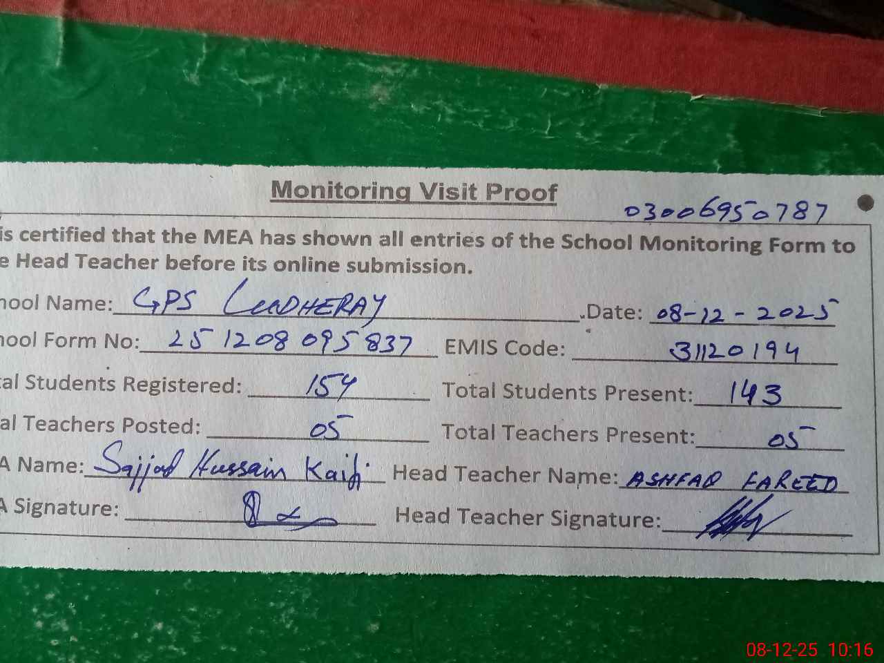 | Attendance Register | Head Teacher | MEA with School | Visit Proof |