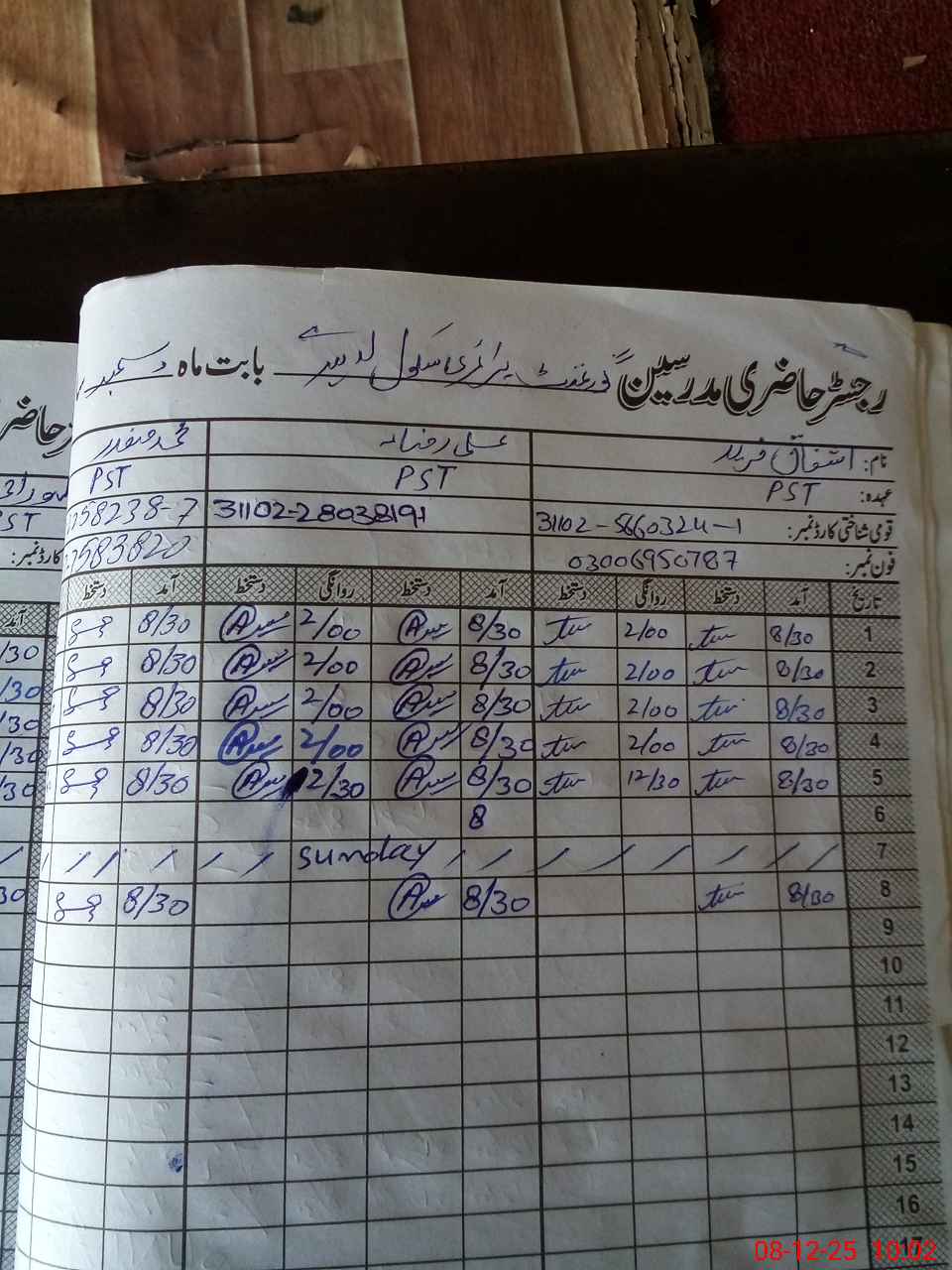 | CNIC | Full Name | Designation | R/C | Absence During Last Calender Month |
