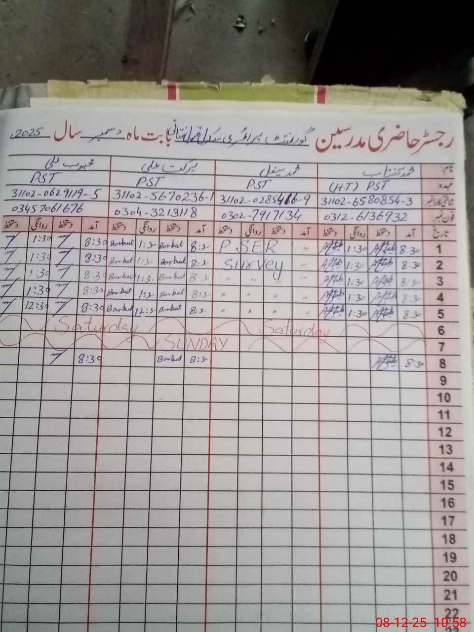 | CNIC | Full Name | Designation | R/C | Absence During Last Calender Month |