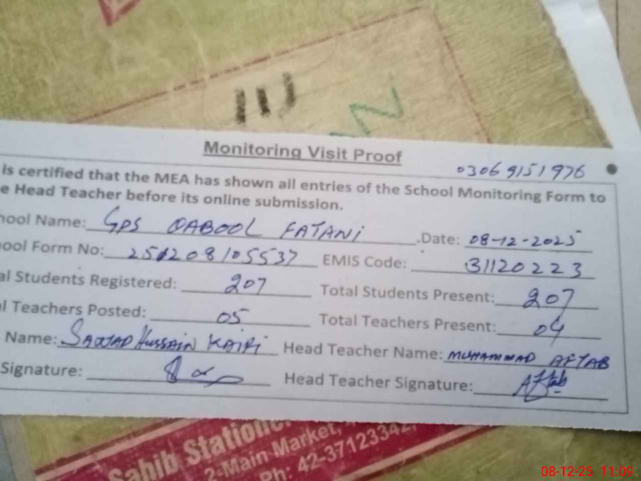 | Attendance Register | Head Teacher | MEA with School | Visit Proof |