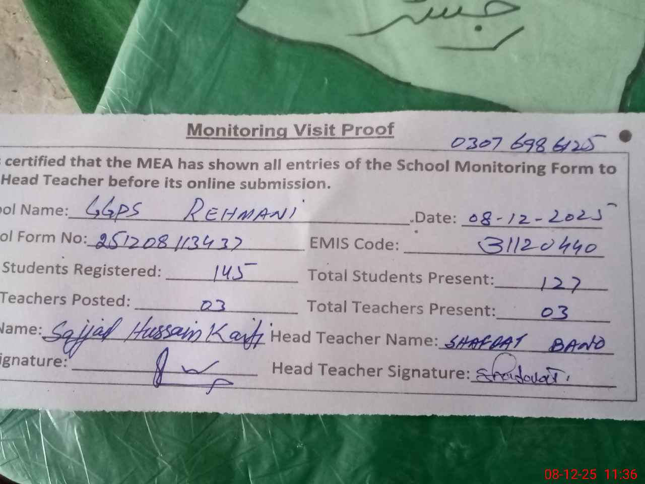 | EMIS Code: 31120440 | Name of School: GGPS REHMANI | |||