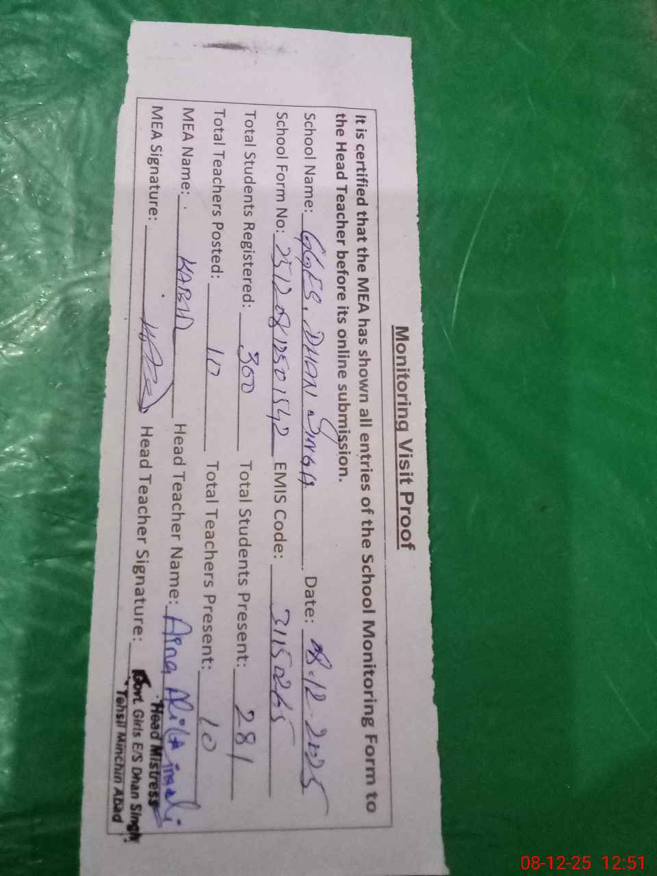 | Certified that this School was Inspected by the Undersigned MEA/DMO Today and the Information Stated Above is as Per Record. | |||||