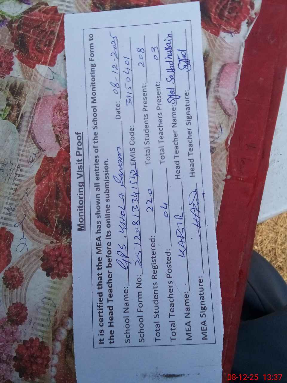| Attendance Register | Head Teacher | MEA with School | Visit Proof |