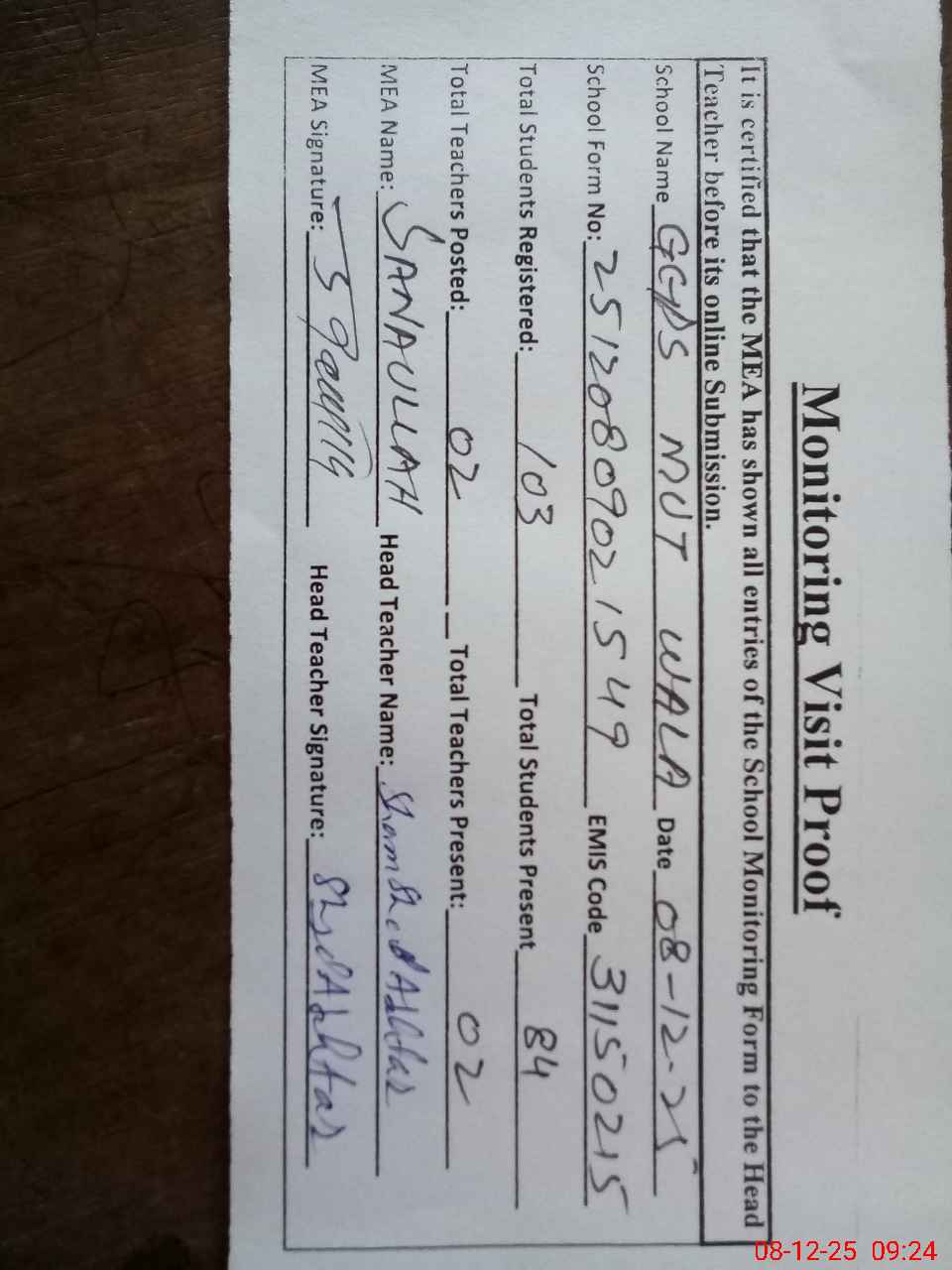| EMIS Code: 31150215 | Name of School: GGPS MUIT WALA | |||