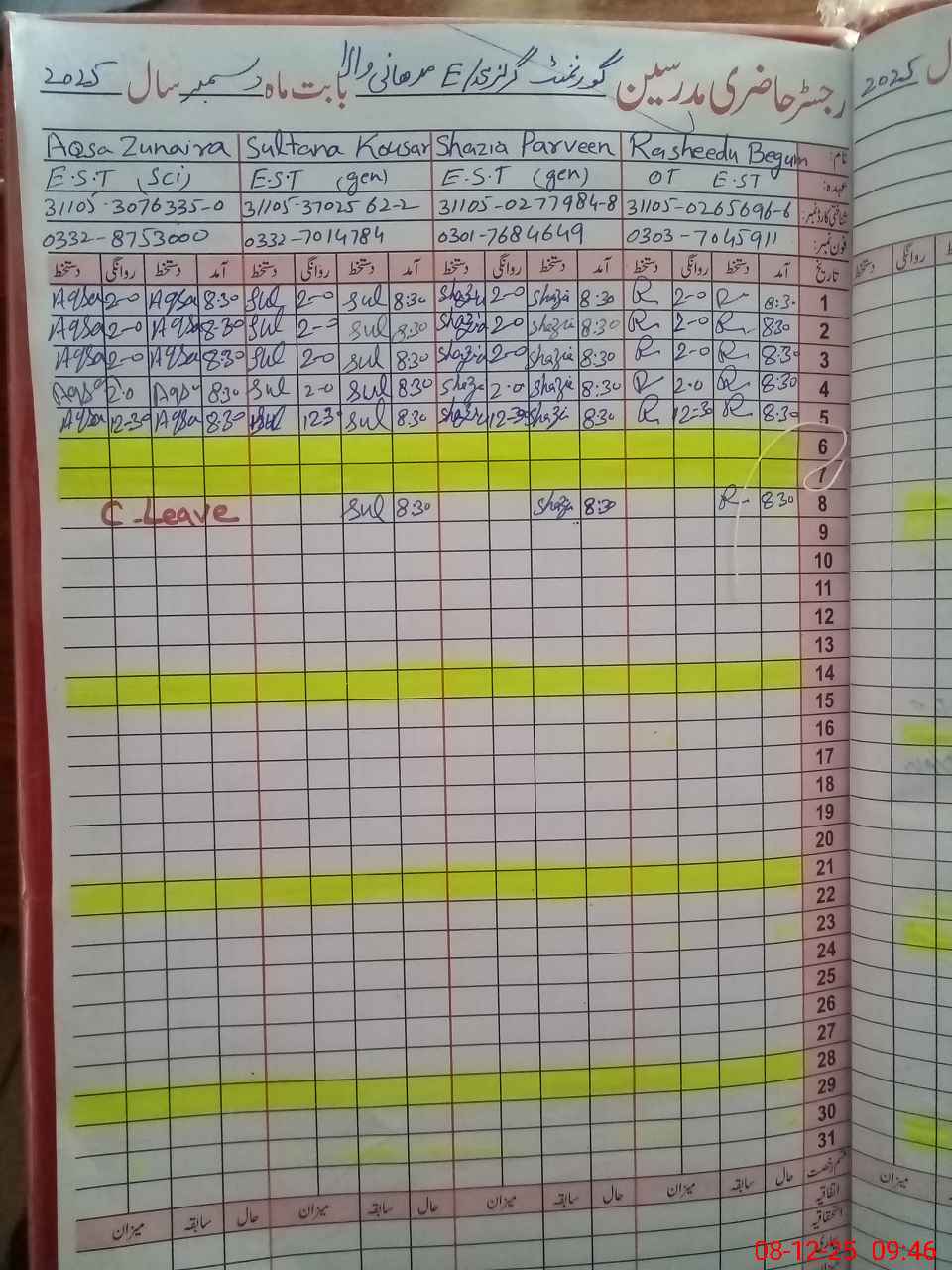 | CNIC | Full Name | Designation | R/C | Absence During Last Calender Month |