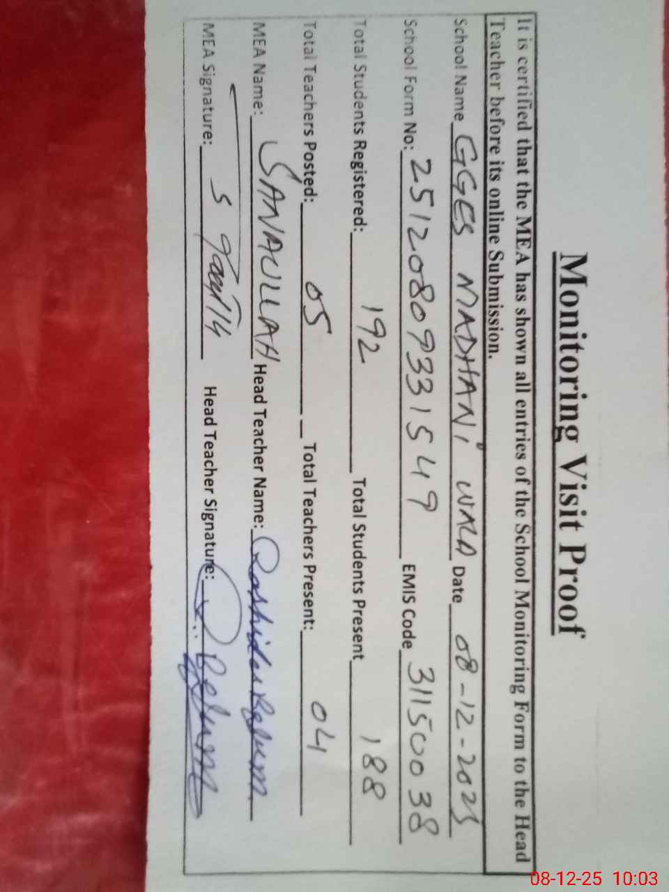 | Attendance Register | Head Teacher | MEA with School | Visit Proof |
