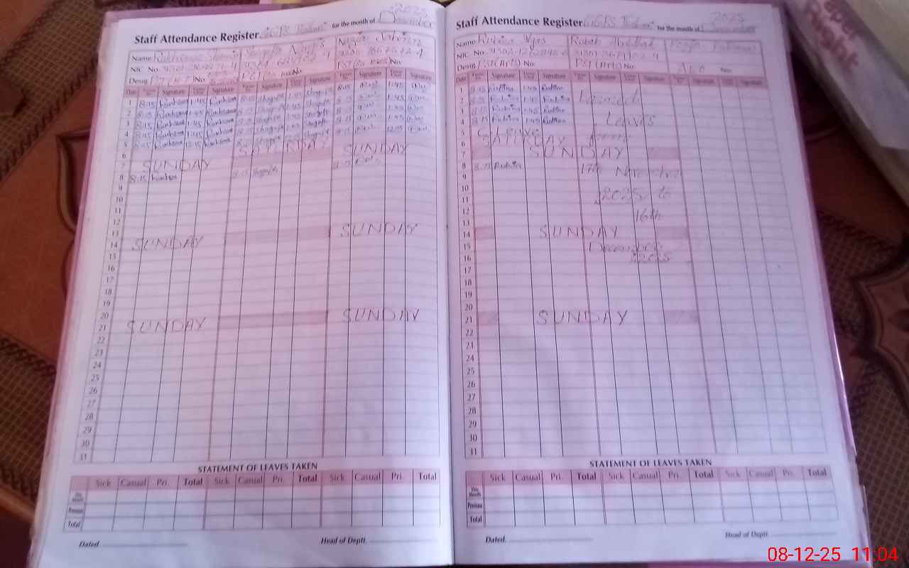 | CNIC | Full Name | Designation | R/C | Absence During Last Calender Month |