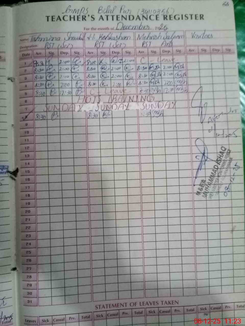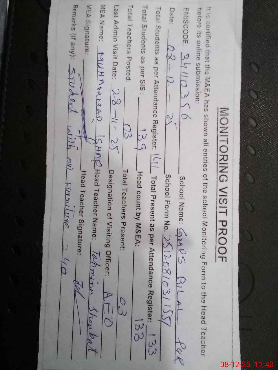 | Attendance Register | Head Teacher | MEA with School | Visit Proof |