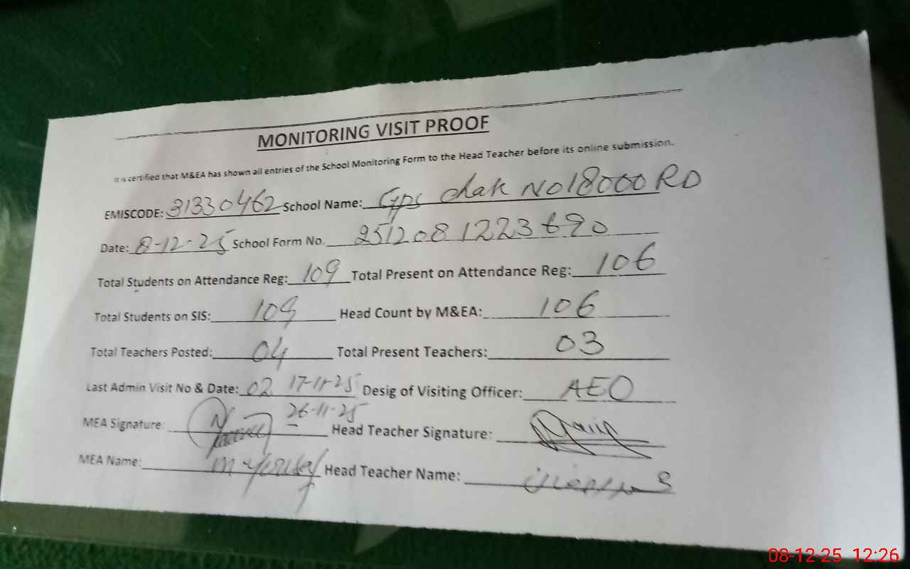 | Attendance Register | Head Teacher | MEA with School | Visit Proof |