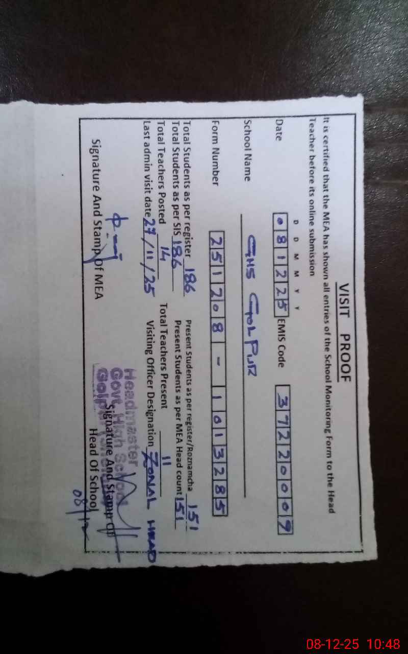 | Attendance Register | Head Teacher | MEA with School | Visit Proof |
