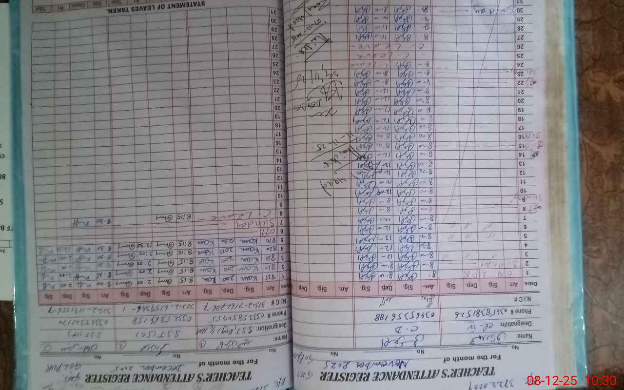 | CNIC | Full Name | Designation | R/C | Absence During Last Calender Month |