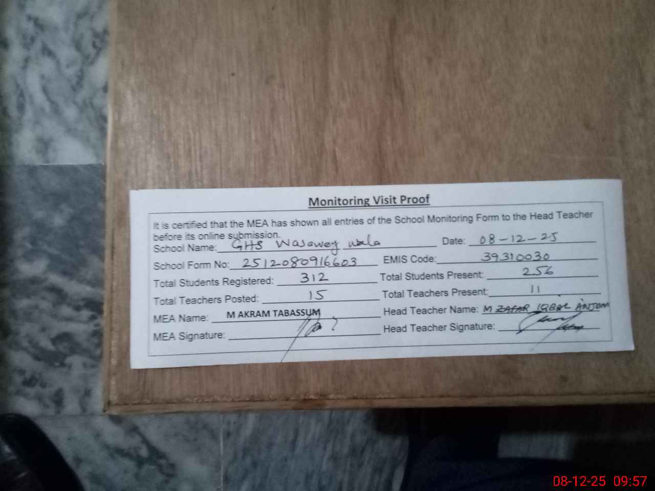 | Attendance Register | Head Teacher | MEA with School | Visit Proof |