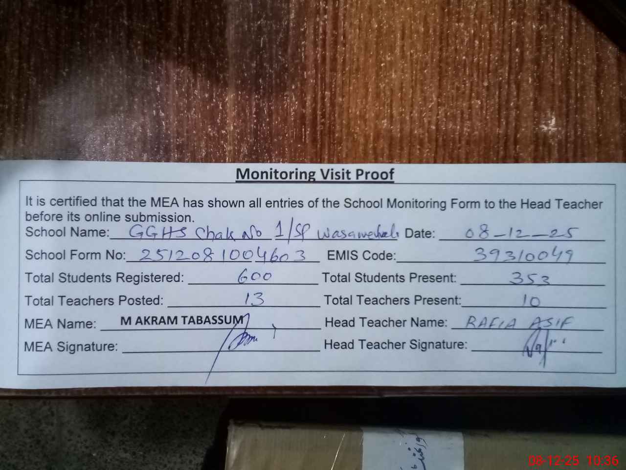 | EMIS Code: 39310049 | Name of School: GGHS CHAK NO. 1/SP WASAWAY WALA | |||
