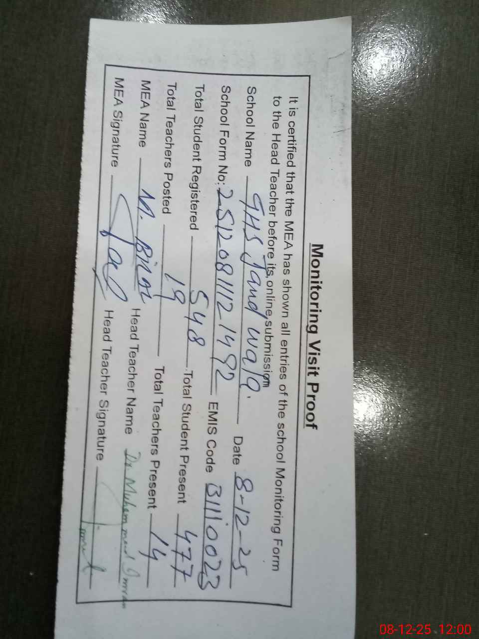 | Attendance Register | Head Teacher | MEA with School | Visit Proof |