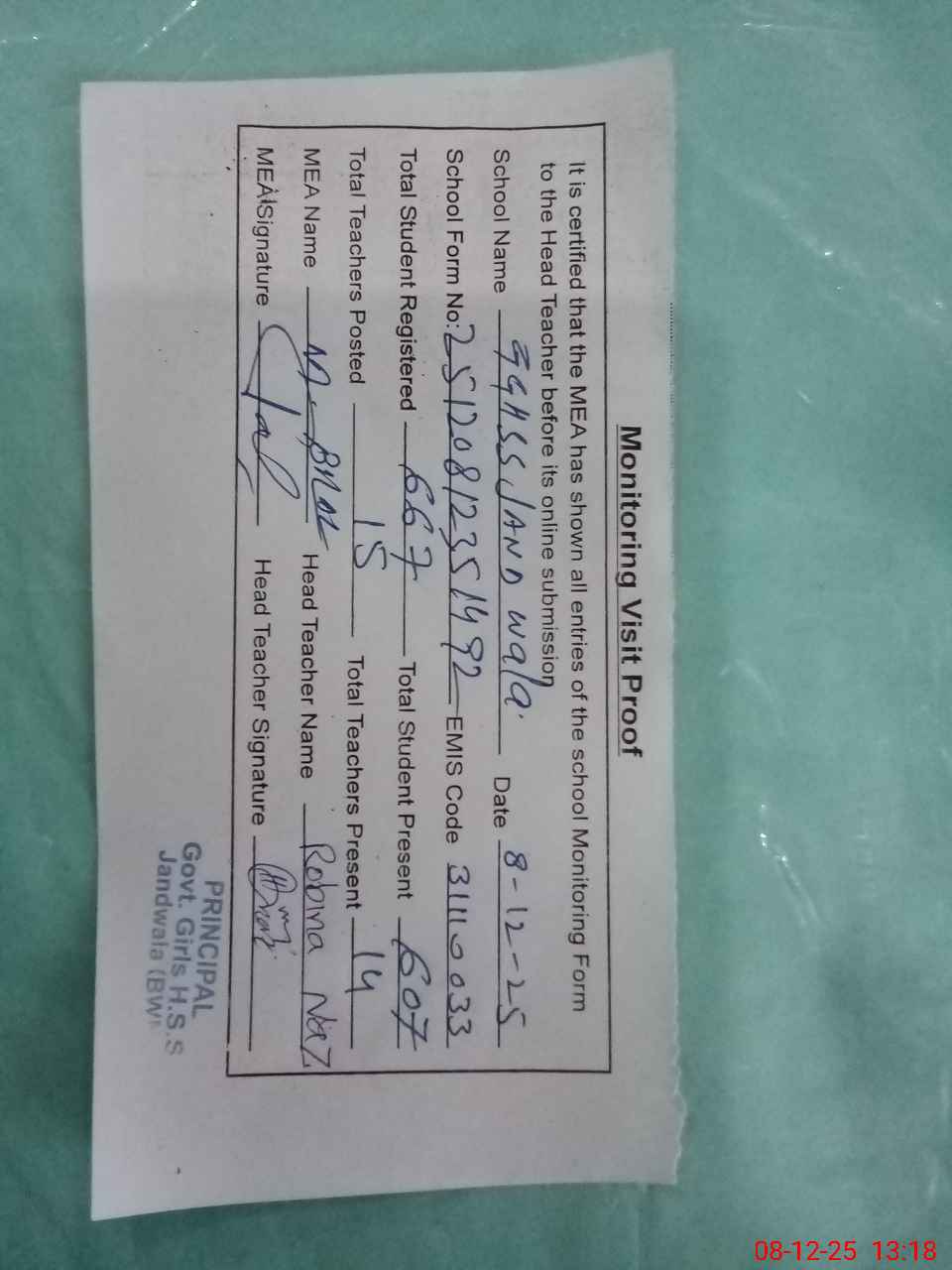 | Attendance Register | Head Teacher | MEA with School | Visit Proof |