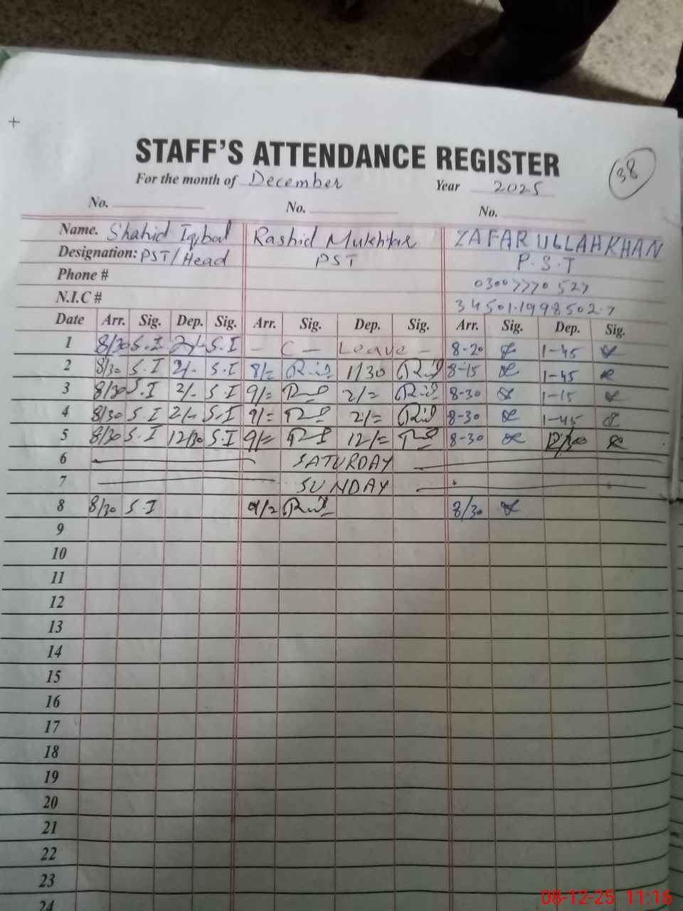 | CNIC | Full Name | Designation | R/C | Absence during last cal. month |