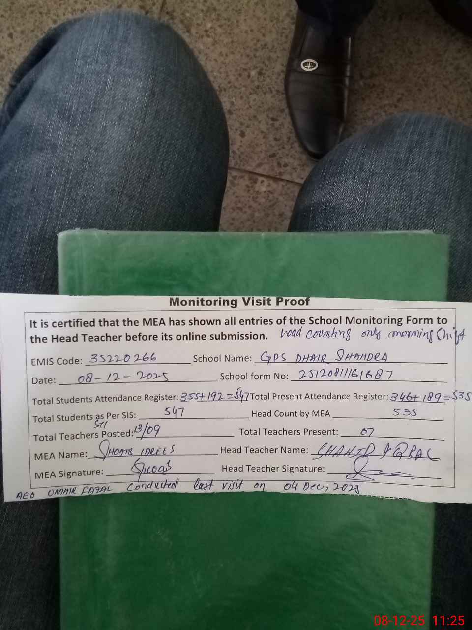 | Attendance Register | Head Teacher | MEA with School | Visit Proof |