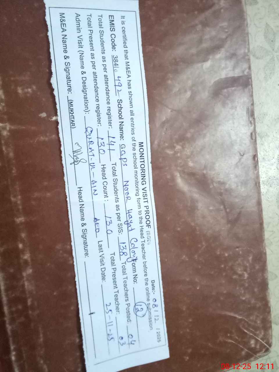 | Attendance Register | Head Teacher | MEA with School | Visit Proof |