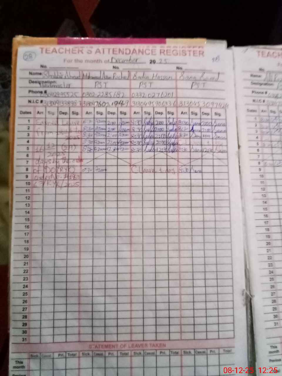 | CNIC | Full Name | Designation | R/C | Absence during last cal. month |