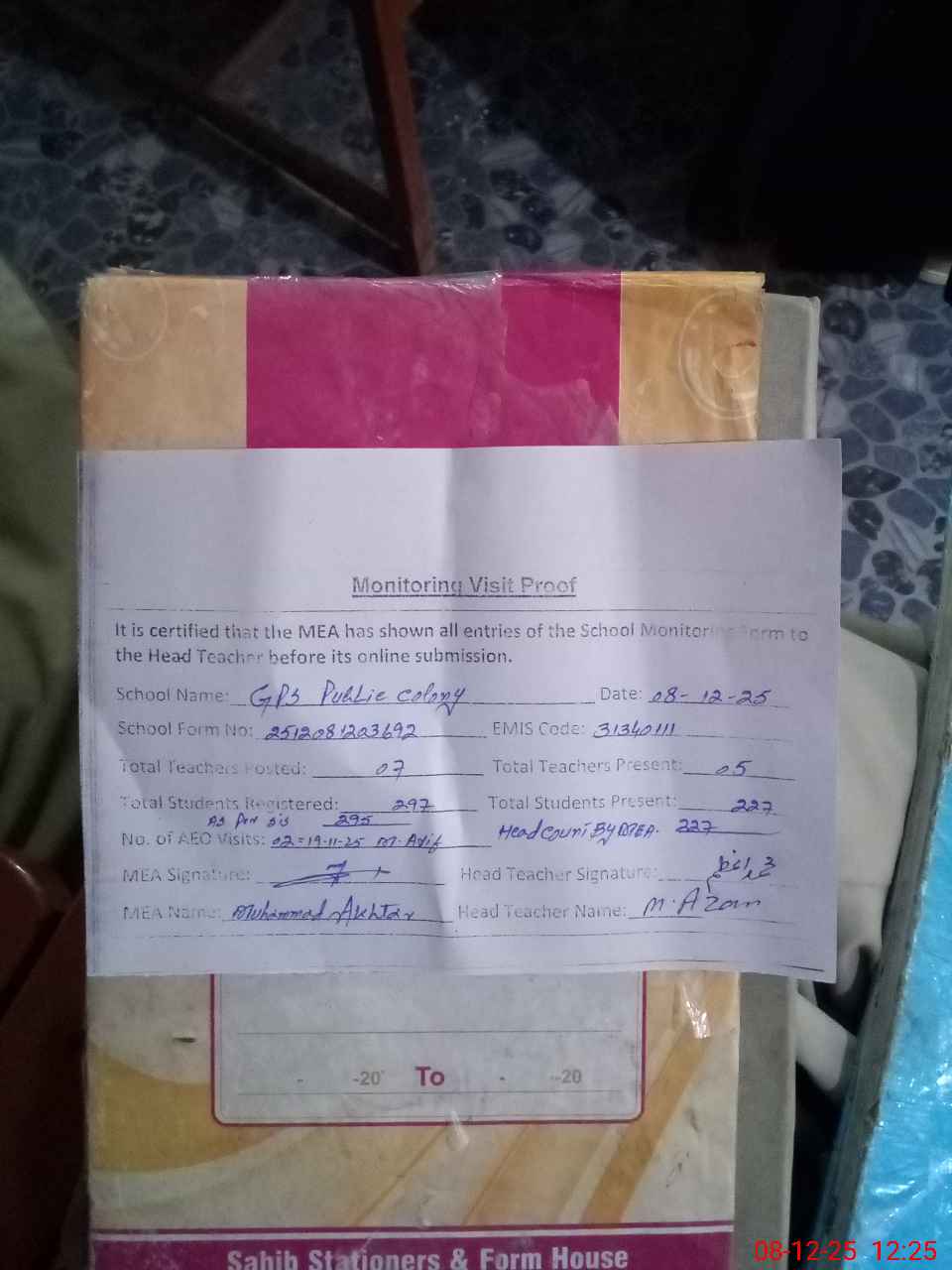 | Attendance Register | Head Teacher | MEA with School | Visit Proof |
