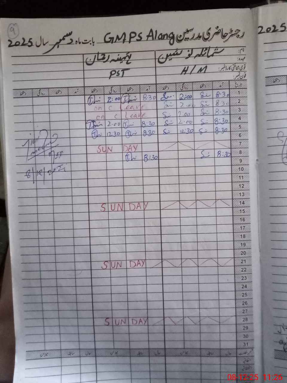 | CNIC | Full Name | Designation | R/C | Absence During Last Calender Month |