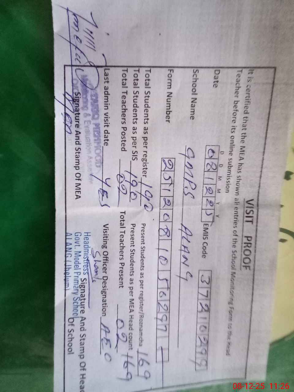 | Attendance Register | Head Teacher | MEA with School | Visit Proof |