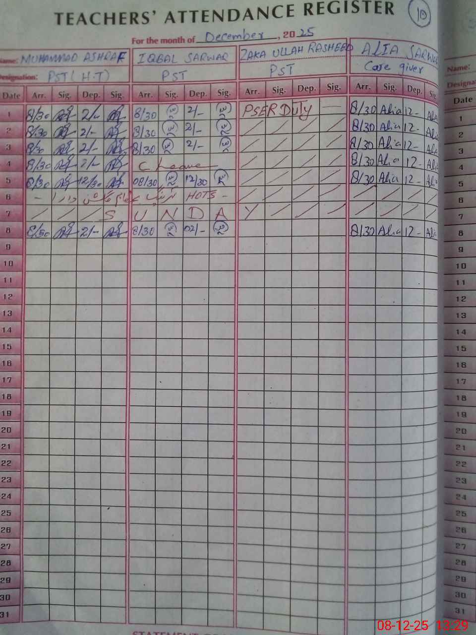 | CNIC | Full Name | Designation | R/C | Absence During Last Calender Month |