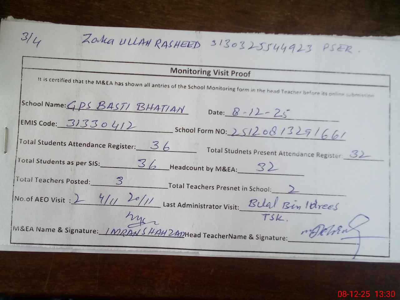 | Attendance Register | Head Teacher | MEA with School | Visit Proof |