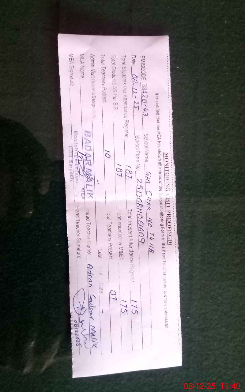 | EMIS Code: 38420143 | Name of School: GHS CHAK NO.74 NB | |||