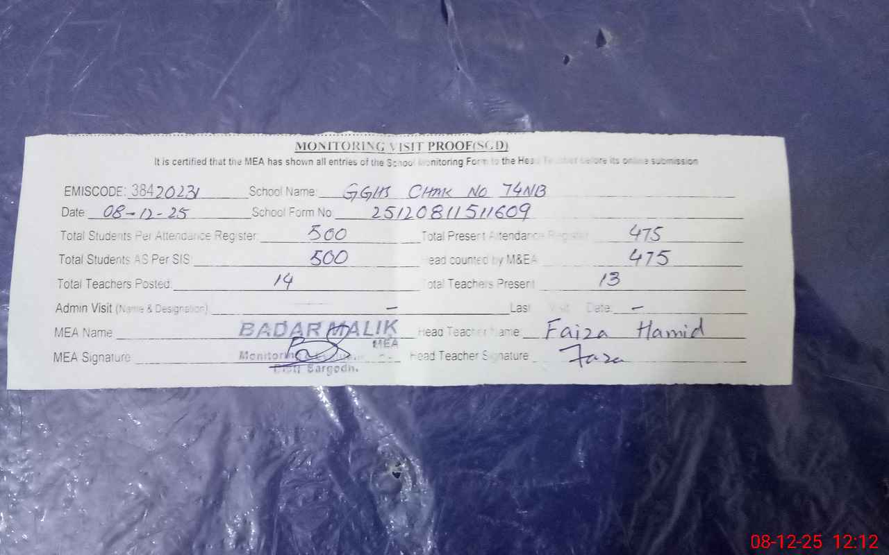 | EMIS Code: 38420231 | Name of School: GGHS CHAK NO.74 NB | |||